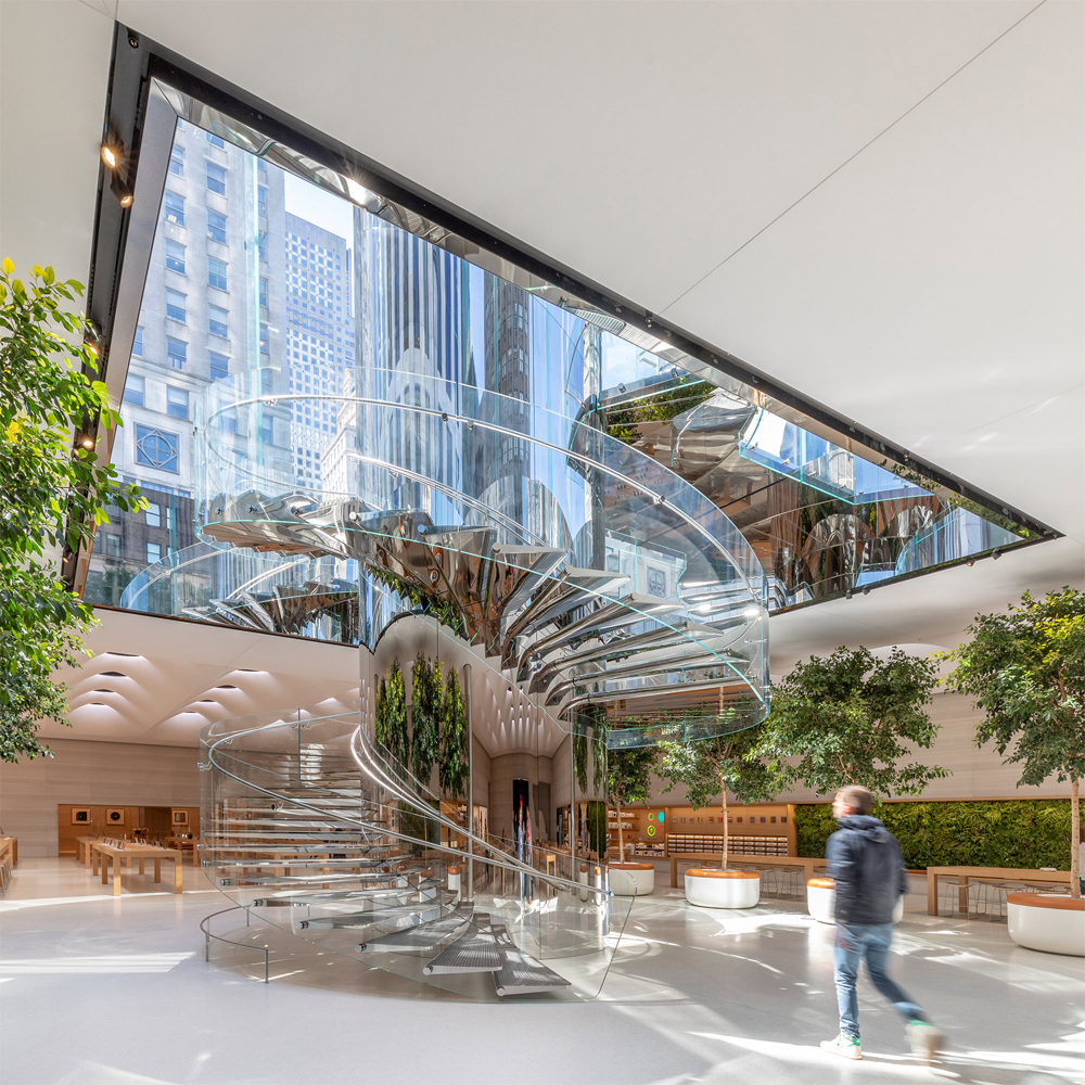 象徴的なのが、スティーブ・ジョブズのアイデアを基に設計されたニューヨーク5番街のApple Storeです。
