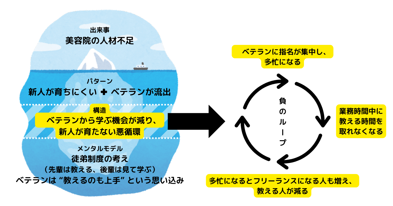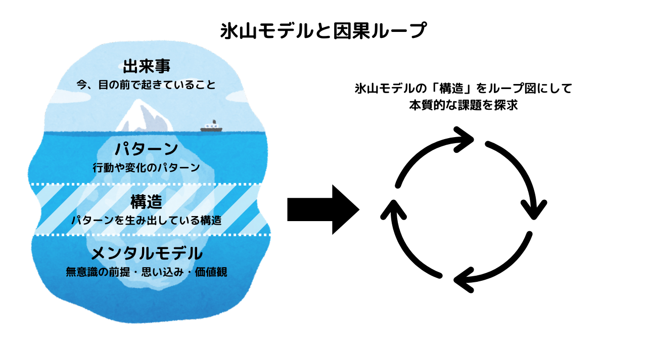 この状況を、氷山モデルと因果ループに落とすと、次のようになります。