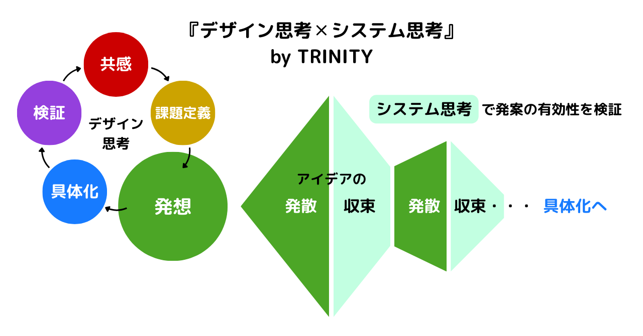 具体的には、デザイン思考プロセスの「アイデア創出〜具体化」の段階でシステム思考を用います。